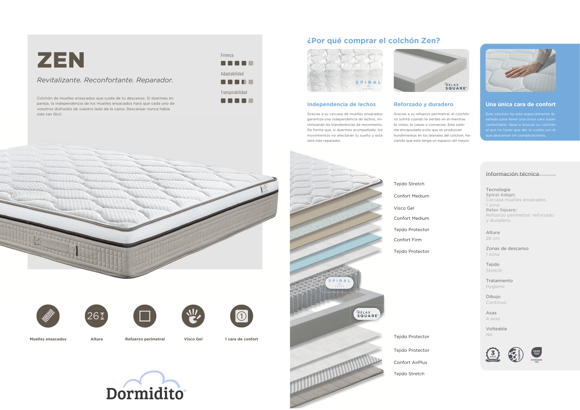 En el colchón ZEN predomina su tecnología de muelle ensacado con un refuerzo perimetral encapsulado y con posibilidad de ser volteable. Esto, sumado única zona de descanso, su altura de 26 cm y su firmeza y transpirabilidad altas, te permite tener el equilibrio perfecto entre comodidad y diseño, permitiendo una dependencia de lechos que minimiza las transferencias de movimiento.